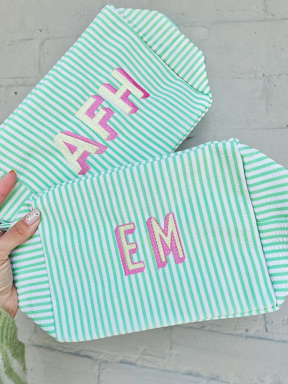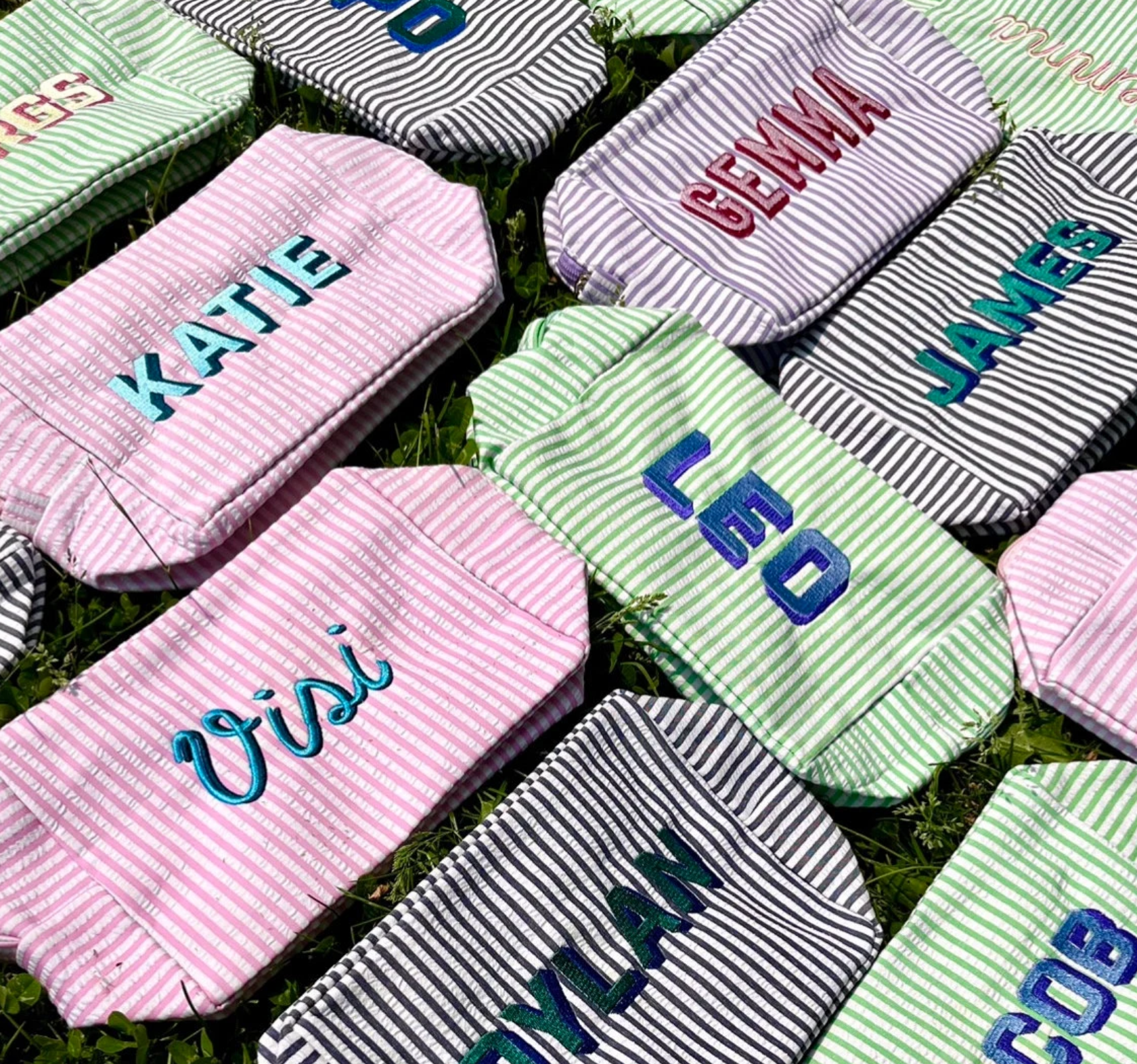 Totally custom and made-to-order, these embroidered seersucker pouches can be personalized with whatever you like! Perfect for your next girls weekend, your kid's overnight bag or a Bachelorette Party recovery kit--customize yours today! Super preppy and awesome for the spring and summer.